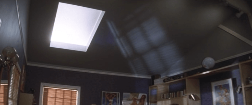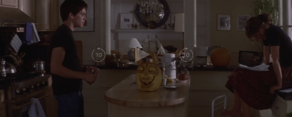 Since their parents are out of town and Elizabeth gets notice she is accepted to Harvard, they decide to have a party. Notice the pumpkin carving of Frank on the counter. They have a connection to Frank between them. Donnie’s bunny and Elizabeth’s boyfriend are one and the same.