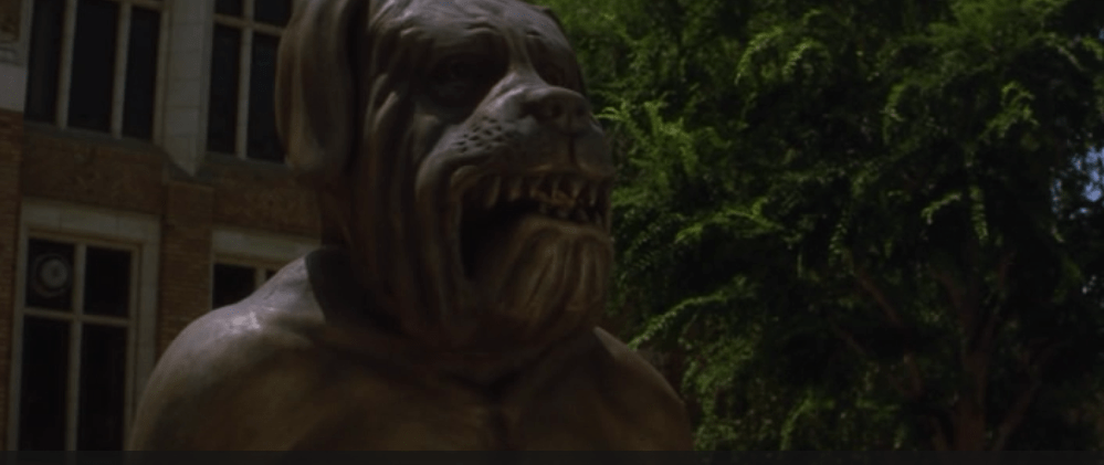 The “mongrel”, school mascot, is chained. Reminds me of the Devil card in the Tarot deck.
