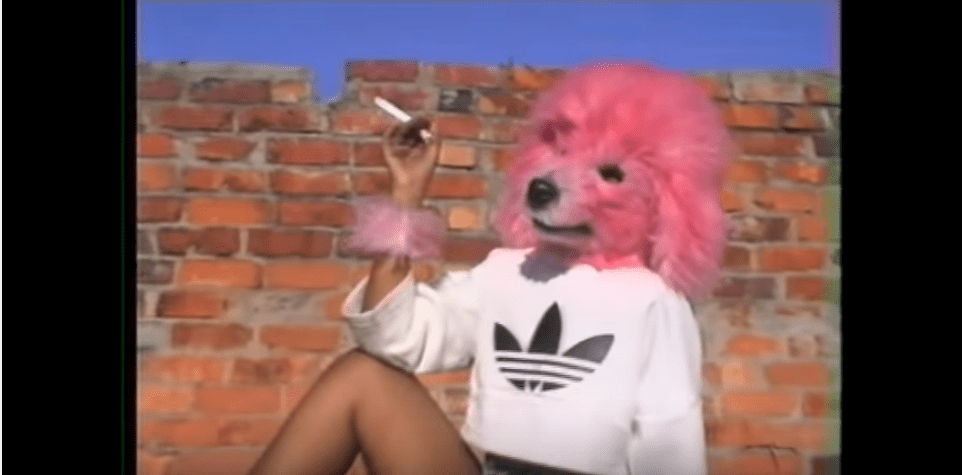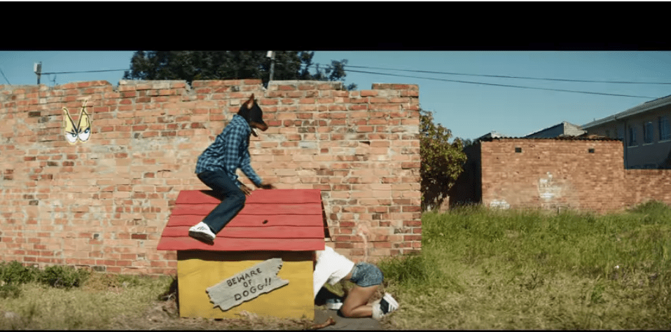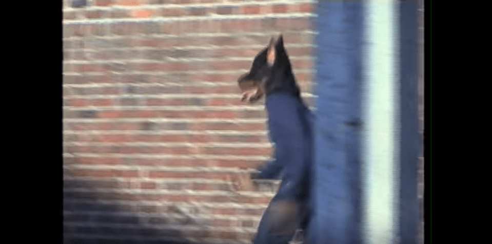 Man in a dog mask… running from the dog catcher.