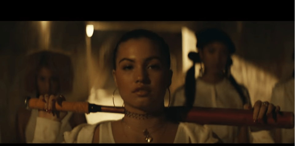 Swinging a bat like in Clockwork Orange, out with her team causing destruction.