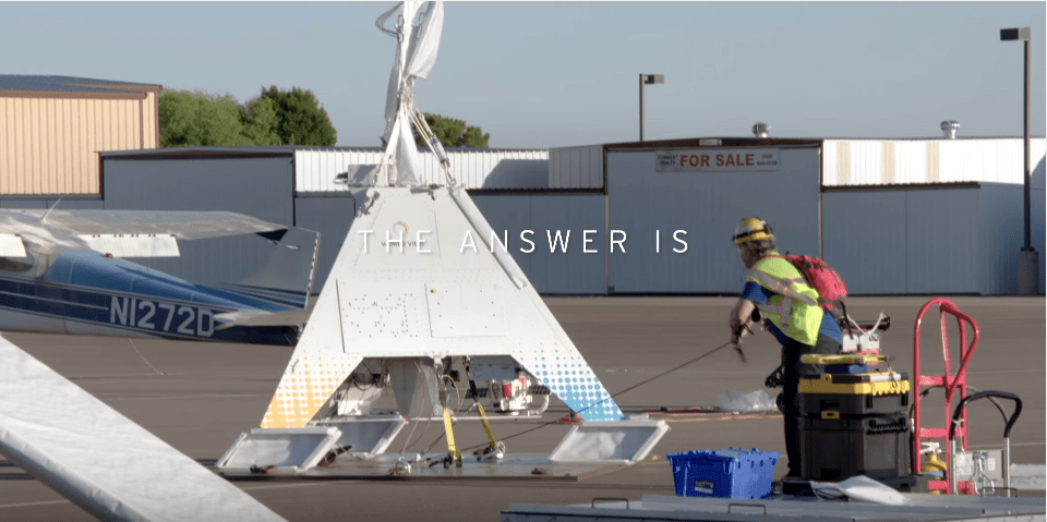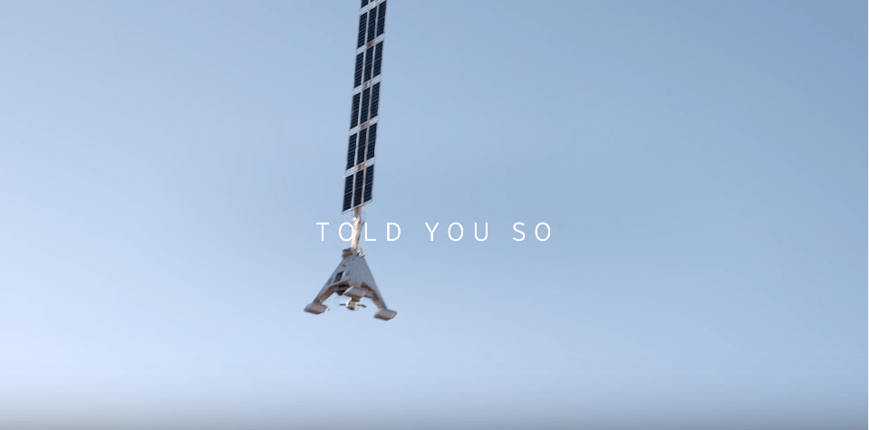 Told you so. Just did.” the commercial tells us. Really? Look at the pyramid on the left with the solar panels above it. Remember this has the balloon attached. Now look at the KFC bucket on the right. How did that bucket get free from that pyramid, with solar panels intact and “float” up there? And how is it being filmed?
